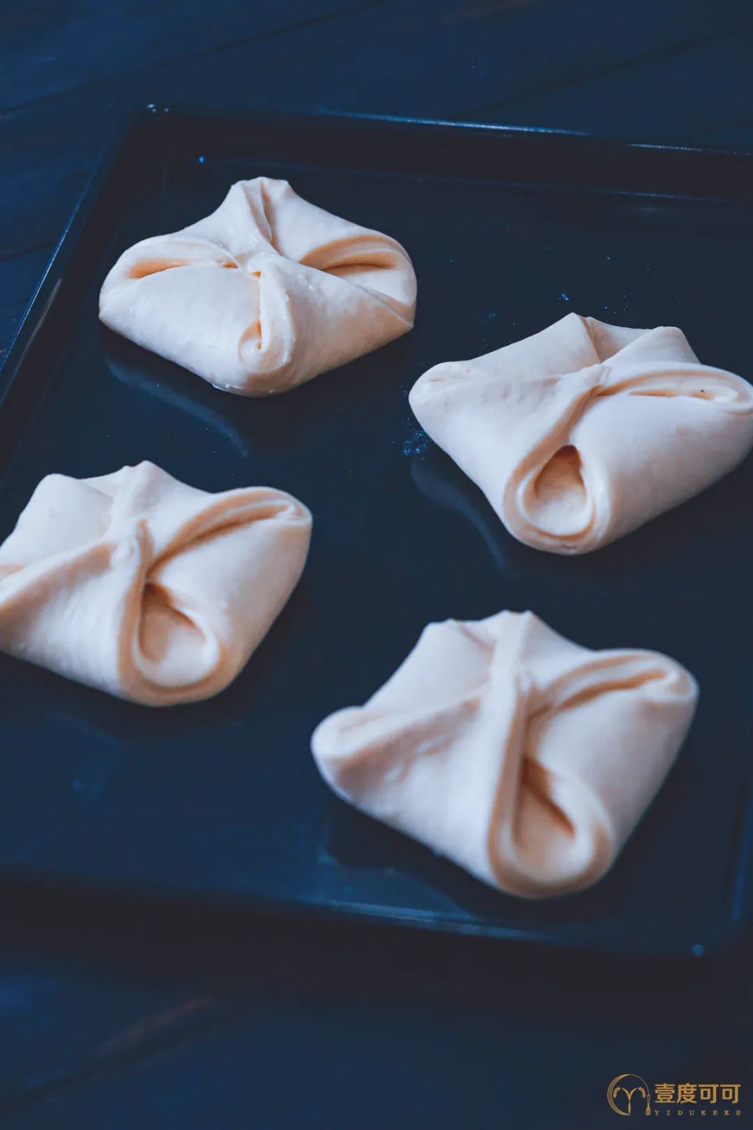 2、塑造丹麦形状:折叠前,在表面喷一些水,然后从方角,将它们折叠到中心并向下压点。重复这些步骤,直到完成所有方角,将它们放在衬有硅纸的烤盘上。